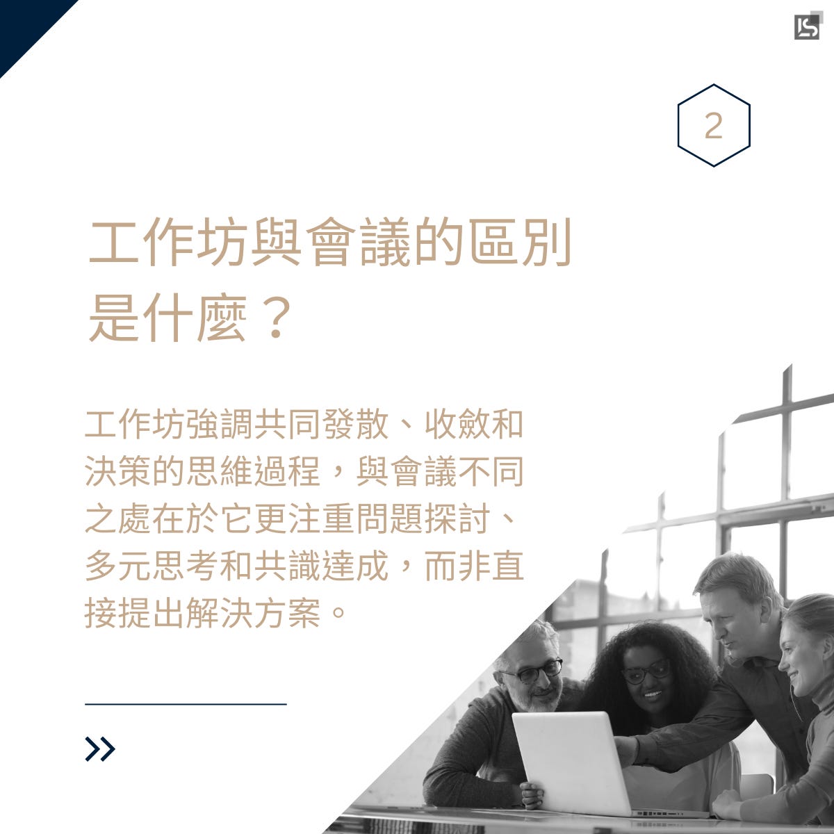 工作坊(Facilitation-based workshops )與傳統會議相比,更強調參與者之間的共同發散和收斂的思維過程。相較於會議,工作坊更著重於問題的深度探討、多元思考和共識的達成,而非僅僅提出解決方案。這種方法能夠激發團隊的創造力和協作精神,有助於找到更全面和有效的解決方案。