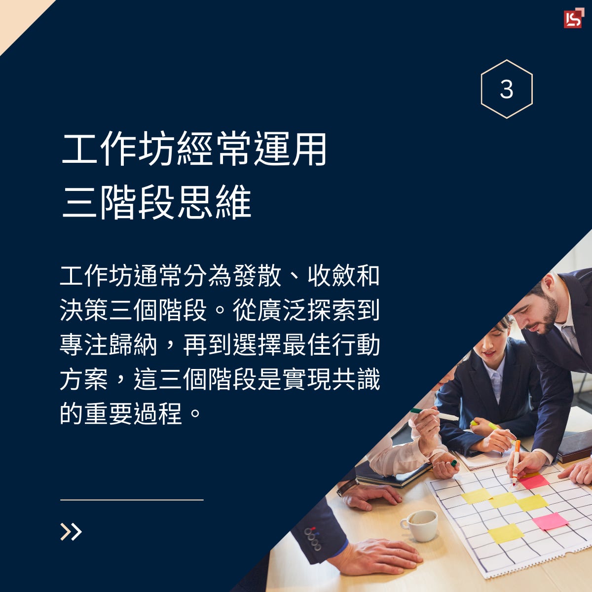 這種三階段思維的過程使工作坊能夠從初期的廣泛探索到最終的行動計劃,並在過程中促進參與者之間的合作和共識達成。這樣的結構有助於確保問題的全面性和深度性探討,並最終導向可行且有效的解決方案。